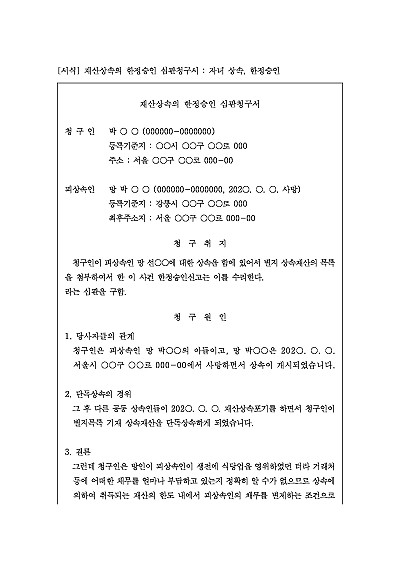 주요내용 : 상속개시 후 상속인이 피상속인의 재산 한도 내에서 채무를 변제하고 남는 것이 있으면 상속하겠다는 의사를 법원에 표기하기 위한 목적으로 사용되어지는 청구서 양식임. 단 무단전재 방지목적으로 PDF 파일로 올리니, 구매하신 후 혹 원본 파일이 필요하신 분들은 톡이나 문자, 메일, 전화 등을 주시면 작성방법 등에 대한 간단한 무료상담과 함께 원본 파일을 보내드리도록 하겠습니다.