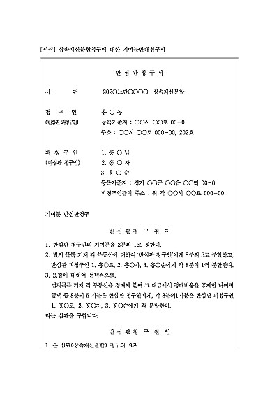 주요내용 다른 공동상속인이 상속재산분할심판을 제기했을 때, 당해 절차를 이용하여 자신이 상속 재산 형성에 특별히 기여했음을 주장하며 상속재산분할 시 더 많은 재산을 분할받기 위한 목적으로 사용되어지는 청구서 양식임단 무단전재 방지목적으로 PDF 파일로 올리니구매하신 후 혹 원본 파일이 필요하신 분들은 톡이나 문자메일전화 등을 주시면 작성방법 등에 대한 간단한 무료상담과 함께 원본 파일을 보내드리도록 하겠습니다.