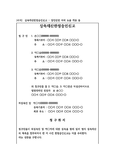 주요내용 : 상속개시 후 상속인이 피상속인의 재산 한도 내에서 채무를 변제하고 남는 것이 있으면 상속하겠다는 의사를 법원에 표기하기 위한 목적으로 사용되어지는 청구서 양식임. 단 무단전재 방지목적으로 PDF 파일로 올리니, 구매하신 후 혹 원본 파일이 필요하신 분들은 톡이나 문자, 메일, 전화 등을 주시면 작성방법 등에 대한 간단한 무료상담과 함께 원본 파일을 보내드리도록 하겠습니다.
