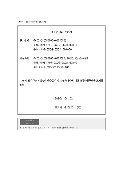 주요내용 : 상속개시전 유류분권청구권의 포기는 불가하며 만일 포기를 하더라도 법적 효력이 없다, 따라 유류분권리를 포기하려면 상속이 개시된 이후 법이 정한 절차와 방식에 따라 포기해야 하는데, 이때 사용되어지는 양식임. 단 무단전재 방지목적으로 PDF 파일로 올리니, 구매하신 후 혹 원본 파일이 필요하신 분들은 톡이나 문자, 메일, 전화 등을 주시면 작성방법 등에 대한 간단한 무료상담과 함께 원본 파일을 보내드리도록 하겠습니다.