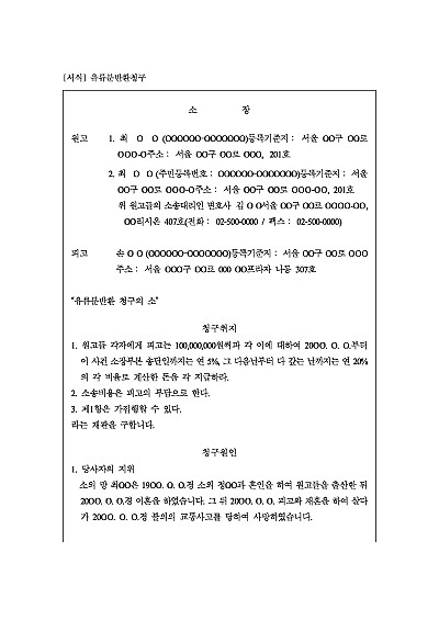 주요내용 : 생전 자식 중 1인에 재산 증여, 다른 상속인들의 유류분권침해시 당해 유류분을 반환받기 위한 목적으로 사용되어지는 소장 양식임. 단 무단전재 방지목적으로 PDF 파일로 올리니, 구매하신 후 혹 원본 파일이 필요하신 분들은 톡이나 문자, 메일, 전화 등을 주시면 작성방법 등에 대한 간단한 무료상담과 함께 원본 파일을 보내드리도록 하겠습니다.