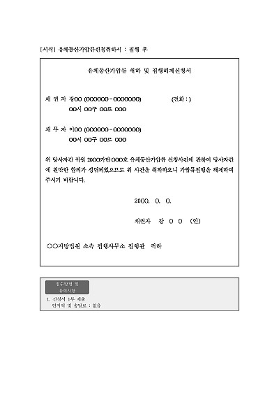 주요내용 : 유체동산 가압류신청 및 결정 후 사정에 의하여 당해 가압류 취소 및 집행해제 신청을 구하기 위한 목적으로 사용되어지는 신청서 양식임. 단 무단전재 방지목적으로 PDF 파일로 올리니, 구매하신 후 혹 원본 파일이 필요하신 분들은 톡이나 문자, 메일, 전화 등을 주시면 작성방법 등에 대한 간단한 무료상담과 함께 원본 파일을 보내드리도록 하겠습니다.