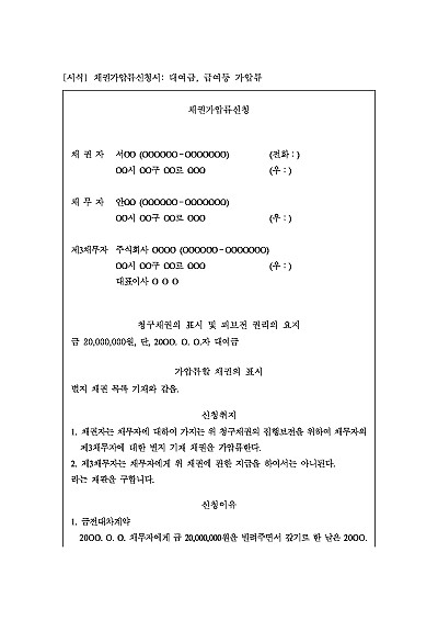 주요내용 : 금전대차계약, 미변제, 채무자를 상대로 대여금 청구 소송을 준비하면서 채무자 소유의 부동산 등의 책임재산이 존재하지 아니할 경우 그 차선으로 채무자의 급여 등 채권의 보전을 목적으로 사용되어지는 신청서 양식임. 단 무단전재 방지목적으로 PDF 파일로 올리니, 구매하신 후 혹 원본 파일이 필요하신 분들은 톡이나 문자, 메일, 전화 등을 주시면 작성방법 등에 대한 간단한 무료상담과 함께 원본 파일을 보내드리도록 하겠습니다.