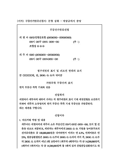 주요내용 : 여신거래약정, 분할상환 조건, 대출미변제, 타절차에서 일부 변제출당, 나머지 대여금에 대하 채무자를 상대로 한 대여금청구의 소송을 준비하면서, 책임재산 보전을 위한 목적으로 채무자 소유의 부동산에 대한 가압류신청시 사용되어지는 신청서 양식임. 단 무단전재 방지목적으로 PDF 파일로 올리니, 구매하신 후 혹 원본 파일이 필요하신 분들은 톡이나 문자, 메일, 전화 등을 주시면 작성방법 등에 대한 간단한 무료상담과 함께 원본 파일을 보내드리도록 하겠습니다.