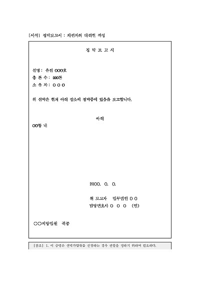 주요내용 : 선박에 대한 가압류시 그 관할을 정하기 위한 자료로 사용하기 위한 목적으로 발급되어지는 양식임. 단 무단전재 방지목적으로 PDF 파일로 올리니, 구매하신 후 혹 원본 파일이 필요하신 분들은 톡이나 문자, 메일, 전화 등을 주시면 작성방법 등에 대한 간단한 무료상담과 함께 원본 파일을 보내드리도록 하겠습니다.