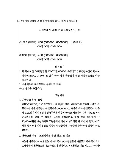 주요내용 : 가압류결정, 본안소송 조정으로 확정, 상대방 조정조항 이행 불응, 상대방의 귀책사유로 조정조항이 이행되지 아니함을 이유로 사정변경에 기하여 당해 가압류결정의 취소를 구하기 위한 목적으로 사용되어지는 신청서 양식임. 단 무단전재 방지목적으로 PDF 파일로 올리니, 구매하신 후 혹 원본 파일이 필요하신 분들은 톡이나 문자, 메일, 전화 등을 주시면 작성방법 등에 대한 간단한 무료상담과 함께 원본 파일을 보내드리도록 하겠습니다.