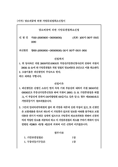 주요내용 : 가압류결정 및 집행, 담보제공에 의한 가압류결정취소신청을 위한 목적으로 사용되어지는 신청서 양식임. 단 무단전재 방지목적으로 PDF 파일로 올리니, 구매하신 후 혹 원본 파일이 필요하신 분들은 톡이나 문자, 메일, 전화 등을 주시면 작성방법 등에 대한 간단한 무료상담과 함께 원본 파일을 보내드리도록 하겠습니다.