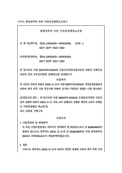 주요내용 : 가압류결정, 해방공탁 후 가압류집행취소신청시 사용되어지는 신청서 양식임. 단 무단전재 방지목적으로 PDF 파일로 올리니, 구매하신 후 혹 원본 파일이 필요하신 분들은 톡이나 문자, 메일, 전화 등을 주시면 작성방법 등에 대한 간단한 무료상담과 함께 원본 파일을 보내드리도록 하겠습니다.