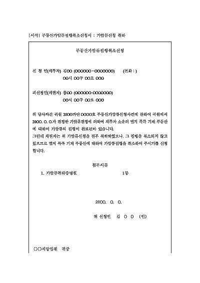 주요내용 : 가압류결정 후 가압류신청취 시 당해 가압류집행의 취소를 구하기 위한 목적으로 사용되어지는 신청서 양식임. 단 무단전재 방지목적으로 PDF 파일로 올리니, 구매하신 후 혹 원본 파일이 필요하신 분들은 톡이나 문자, 메일, 전화 등을 주시면 작성방법 등에 대한 간단한 무료상담과 함께 원본 파일을 보내드리도록 하겠습니다.