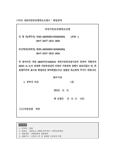 주요내용 : 가압류결정, 해방공탁을 이유로 당해 가압류결정의 집행을 취소하기 위한 목적으로 사용되어지는 신청서 양식임. 단 무단전재 방지목적으로 PDF 파일로 올리니, 구매하신 후 혹 원본 파일이 필요하신 분들은 톡이나 문자, 메일, 전화 등을 주시면 작성방법 등에 대한 간단한 무료상담과 함께 원본 파일을 보내드리도록 하겠습니다.