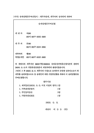 주요내용 : 가압류결정, 채무자 사망, 그 집행을 위하여 채무자의 상속인을 상대로 승계집행문부여신청시 사용되어지는 신청서 양식임. 단 무단전재 방지목적으로 PDF 파일로 올리니, 구매하신 후 혹 원본 파일이 필요하신 분들은 톡이나 문자, 메일, 전화 등을 주시면 작성방법 등에 대한 간단한 무료상담과 함께 원본 파일을 보내드리도록 하겠습니다.