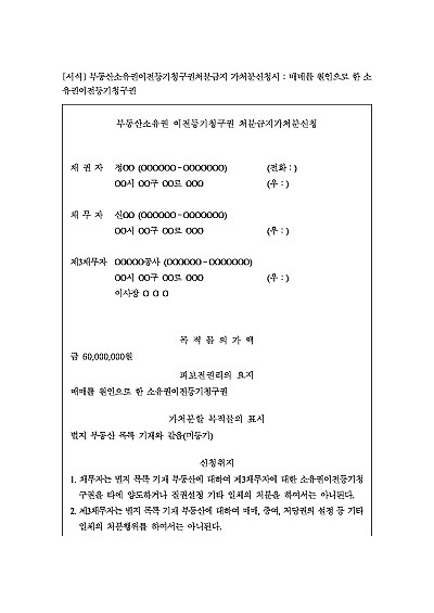 주요내용 : 매매, 미등기, 매도인 타에 매도 획책, 매도인을 상대로 매매를 원인으로 한 소유권이전등기의 본안 소송을 준비 중, 현재 채무자 명의로 되어 있음을 기화 제3자에 대한 처분행위를 금지하기 위한 목적으로 사용되어지는 가처분 신청서 양식임. 단 무단전재 방지목적으로 PDF 파일로 올리니, 구매하신 후 혹 원본 파일이 필요하신 분들은 톡이나 문자, 메일, 전화 등을 주시면 작성방법 등에 대한 간단한 무료상담과 함께 원본 파일을 보내드리도록 하겠습니다.