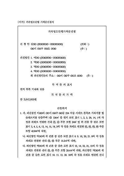 주요내용 : 가옥 불법점유 사용, 명도요구 거절, 소유권에 기한 방해배제청구권의 행사로서 불법점유 사용 중인 가옥에 대한 명도를 구하는 본안 소송을 준비하면서 채무자들이 현재 불법 점유 사용 중인 가옥에 대한 악의적인 처분행위 등의 피해를 방지하기 위한 목적으로 본안판결 전 미리 가옥을 명도받기 위한 목적으로 사용되어지는 가처분 신청서 양식임. 단 무단전재 방지목적으로 PDF 파일로 올리니, 구매하신 후 혹 원본 파일이 필요하신 분들은 톡이나 문자, 메일, 전화 등을 주시면 작성방법 등에 대한 간단한 무료상담과 함께 원본 파일을 보내드리도록 하겠습니다.