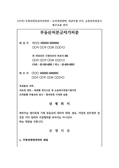 주요내용 : 소송(본안소송)을 통해 부동산을 되찾거나 소유권을 가져오려는 채권자가, 채무자가 미리 부동산을 매매, 증여, 저당권 설정 등 일체 처분행위를 하지 못하도록 법원의 판결 전까지 해당 부동산의 현 상태를 묶어두는 법적 보전 절차임. 단 무단전재 방지목적으로 PDF 파일로 올리니, 구매하신 후 혹 원본 파일이 필요하신 분들은 톡이나 문자, 메일, 전화 등을 주시면 작성방법 등에 대한 간단한 무료상담과 함께 원본 파일을 보내드리도록 하겠습니다.