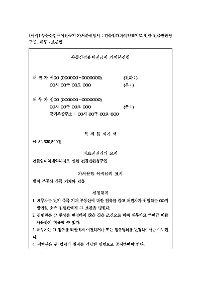 주요내용 : 임대차계약, 차임연체, 계약해지 통지, 채무자를 상대로 임대차계약해지를 원인으로 한 건물명도청구의 본안 소송 준비 중, 목적을 채무자가 점유하고 있음을 기화로 이를 제3자에 임대 등 처분 행위의 획책을 금지하기 위한 목적으로 사용되어지는 가처분 신청서 양식임. 단 무단전재 방지목적으로 PDF 파일로 올리니, 구매하신 후 혹 원본 파일이 필요하신 분들은 톡이나 문자, 메일, 전화 등을 주시면 작성방법 등에 대한 간단한 무료상담과 함께 원본 파일을 보내드리도록 하겠습니다.