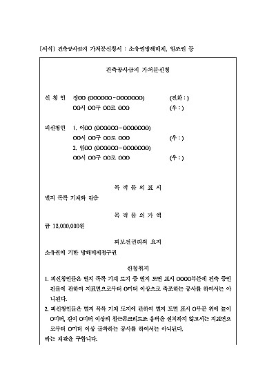 주요내용 : 인근지 건축공사, 일조권 등 침해 예상, 대책강구 요청, 강구약속 및 공사 일방적 강행, 일조권 침해 등을 이유로 공사금지 등 본안의 소송을 준비하면서 공사 강행으로 인한 중대한 피해방지 목적으로 본안판결 전까지 당해 공사를 금지시키기 위한 목적으로 사용되어지는 가처분 신청서 양식임. 단 무단전재 방지목적으로 PDF 파일로 올리니, 구매하신 후 혹 원본 파일이 필요하신 분들은 톡이나 문자, 메일, 전화 등을 주시면 작성방법 등에 대한 간단한 무료상담과 함께 원본 파일을 보내드리도록 하겠습니다.