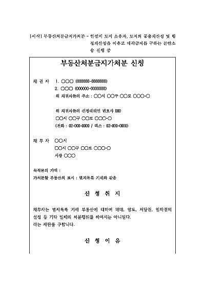 주요내용 : 소송(본안소송)을 통해 부동산을 되찾거나 소유권을 가져오려는 채권자가, 채무자가 미리 부동산을 매매, 증여, 저당권 설정 등 일체 처분행위를 하지 못하도록 법원의 판결 전까지 해당 부동산의 현 상태를 묶어두는 법적 보전 절차임. 단 무단전재 방지목적으로 PDF 파일로 올리니, 구매하신 후 혹 원본 파일이 필요하신 분들은 톡이나 문자, 메일, 전화 등을 주시면 작성방법 등에 대한 간단한 무료상담과 함께 원본 파일을 보내드리도록 하겠습니다.