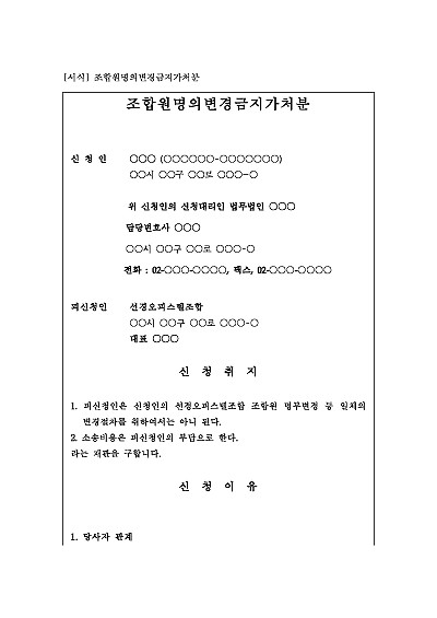 주요내용 : 조합원 간 분쟁, 조합원 자격 상실 위험 등 권리 침해가 우려될 때 조합(제3채무자)이 명의를 변경해주지 못하게 막아 소유권 및 권리를 보전하기 위한 목적으로 사용되어지는 신청서 양식임. 단 무단전재 방지 목적으로 PDF 파일로 올리니, 구매하신 후 혹 원본 파일이 필요하신 분들은 톡이나 문자, 메일, 전화 등을 주시면 작성 방법 등에 대한 간단한 무료 상담과 함께 원본 파일을 보내드리도록 하겠습니다.