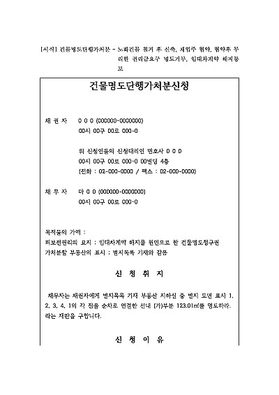주요내용 : 임대차 계약 종료 후 불법 점유자가 부동산을 인도하지 않을 때, 본안 소송(명도 소송)의 판결을 기다리지 않고 긴급하게 점유를 회복하기 위한 목적으로 사용되어지는 신청서 양식임. 단 무단전재 방지 목적으로 PDF 파일로 올리니, 구매하신 후 혹 원본 파일이 필요하신 분들은 톡이나 문자, 메일, 전화 등을 주시면 작성 방법 등에 대한 간단한 무료 상담과 함께 원본 파일을 보내드리도록 하겠습니다.