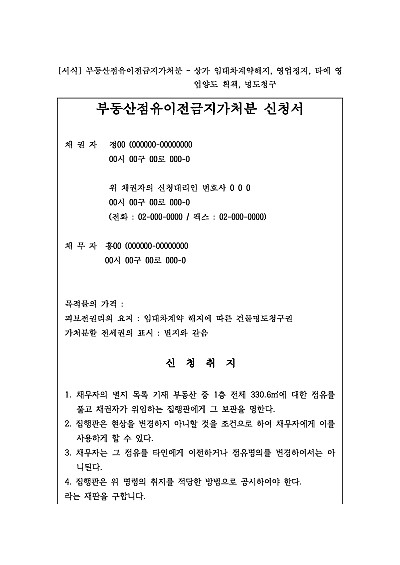 주요내용 : 임차인의 차임연체로 계약해지 및 명도소송 제기하기 전, 임차인인 점유자가 제3자에게 점유를 이전하지 못하도록 현 상태를 유지하기 위한 목적으로 사용되어지는 신청서 양식임 . 단 무단전재 방지 목적으로 PDF 파일로 올리니, 구매하신 후 혹 원본 파일이 필요하신 분들은 톡이나 문자, 메일, 전화 등을 주시면 작성 방법 등에 대한 간단한 무료 상담과 함께 원본 파일을 보내드리도록 하겠습니다.