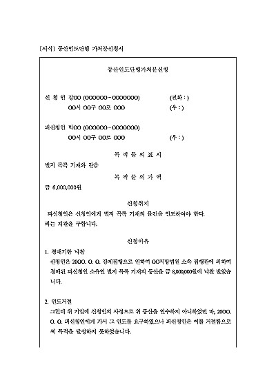 주요내용 : 유체동산 경락에 의한 소유권취득, 경락물 채무자들 점유계속, 인도거절, 멸실 및 훼손 우려, 채무자를 상대로 동산인도 등 본안 소송을 준비 중, 방치중인 목적의 훼손 및 멸실 등 중대한 손해를 방지하기 위한 목적으로 본안판결 전 미리 당해 동산의 인도를 받기 위한 목적으로 사용되어지는 가처분 신청서 양식임. 단 무단전재 방지목적으로 PDF 파일로 올리니, 구매하신 후 혹 원본 파일이 필요하신 분들은 톡이나 문자, 메일, 전화 등을 주시면 작성방법 등에 대한 간단한 무료상담과 함께 원본 파일을 보내드리도록 하겠습니다.