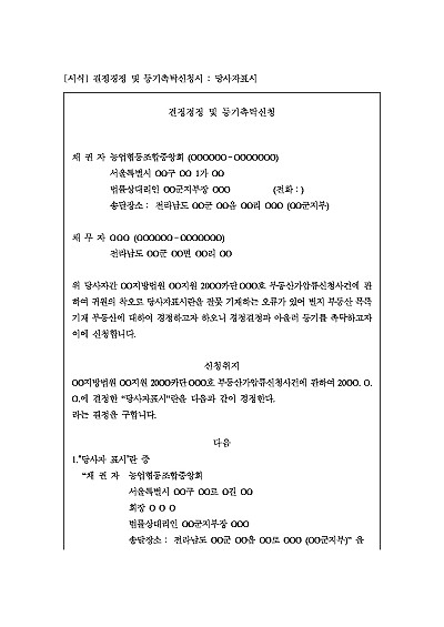 주요내용 : 가압류 신청 후 결정, 결정문에 당사자 표시 오기 등 존재, 그 집행을 위해 당사자 표시를 동일성을 유지하면서 올바르게 경정함과 동기에 그에 기초하여 등기촉탁을 하기 위한 목적으로 사용되어지는 양식임. 단 무단전재 방지목적으로 PDF 파일로 올리니, 구매하신 후 혹 원본 파일이 필요하신 분들은 톡이나 문자, 메일, 전화 등을 주시면 작성방법 등에 대한 간단한 무료상담과 함께 원본 파일을 보내드리도록 하겠습니다.