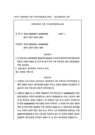 주요내용 : 가처분결정 후 피보전권리의 소멸을 이유로 당해 가처분결정의 취소를 구하기 위한 목적으로 사용되어지는 신청서 양식임. 단 무단전재 방지목적으로 PDF 파일로 올리니, 구매하신 후 혹 원본 파일이 필요하신 분들은 톡이나 문자, 메일, 전화 등을 주시면 작성방법 등에 대한 간단한 무료상담과 함께 원본 파일을 보내드리도록 하겠습니다.