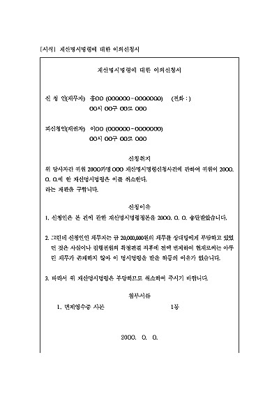 주요내용 : 재산명시명령, 집행권원 확정판결 직후 판결금 전액 변제, 채무부존재, 명시명령의 부당함으로 이유로 그 취소를 구하기 위한 목적으로 사용되어지는 신청서 양식임. 단 무단전재 방지목적으로 PDF 파일로 올리니, 구매하신 후 혹 원본 파일이 필요하신 분들은 톡이나 문자, 메일, 전화 등을 주시면 작성방법 등에 대한 간단한 무료상담과 함께 원본 파일을 보내드리도록 하겠습니다.