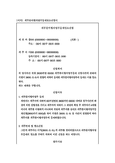 주요내용 : 채무불이행자명부등재, 채무변제 후 말소신청을 구하기 위한 목적으로 사용되어지는 신청서 양식임. 단 무단전재 방지목적으로 PDF 파일로 올리니, 구매하신 후 혹 원본 파일이 필요하신 분들은 톡이나 문자, 메일, 전화 등을 주시면 작성방법 등에 대한 간단한 무료상담과 함께 원본 파일을 보내드리도록 하겠습니다.