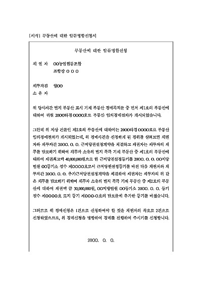 주요내용 : 채권자가 동일한 부동산에 대해 여러 개의 채권을 가지고 각각 압류시청한 경우 이를 하나의 경매절차로 묶어 진행할 목적으로 사용되어지는 신청서 양식임. 단 무단전재 방지목적으로 PDF 파일로 올리니, 구매하신 후 혹 원본 파일이 필요하신 분들은 톡이나 문자, 메일, 전화 등을 주시면 작성방법 등에 대한 간단한 무료상담과 함께 원본 파일을 보내드리도록 하겠습니다.