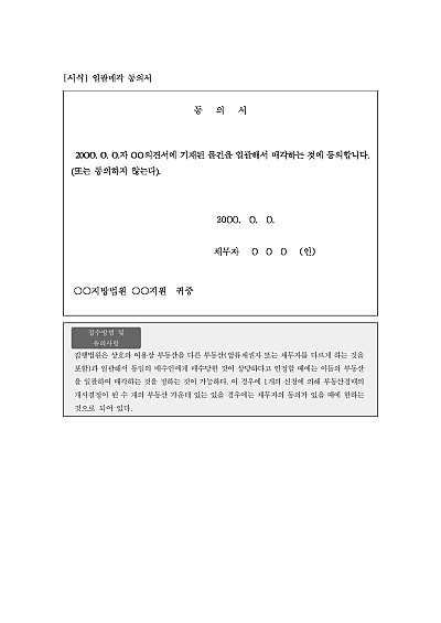 주요내용 : 채무자의 동의를 받아 경매목적물의 일괄매각을 구하기 위한 목적으로 사용되어지는 동의서 양식임. 단 무단전재 방지목적으로 PDF 파일로 올리니, 구매하신 후 혹 원본 파일이 필요하신 분들은 톡이나 문자, 메일, 전화 등을 주시면 작성방법 등에 대한 간단한 무료상담과 함께 원본 파일을 보내드리도록 하겠습니다.