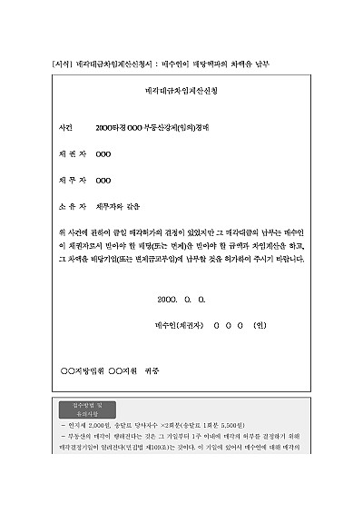 주요내용 : 경매절차에서 매수인이 채권자로서 배당바다야할 금액 등을 매각대금에서 공제해 달라고 신청시 사용되어지는 양식임. 단 무단전재 방지목적으로 PDF 파일로 올리니, 구매하신 후 혹 원본 파일이 필요하신 분들은 톡이나 문자, 메일, 전화 등을 주시면 작성방법 등에 대한 간단한 무료상담과 함께 원본 파일을 보내드리도록 하겠습니다.