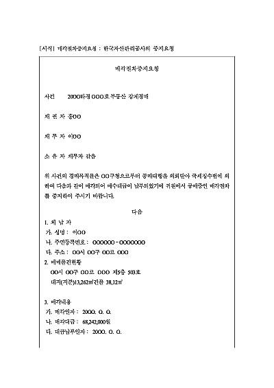 주요내용 : 법원경매절차와는 별개로 진행되는 자산관리공사 공매절차에서 매수인이 먼저 대금을 완납할 경우 법원경매절차는 집행법원이 직원으로 취소하는데, 이때 사용되어지는 양식임. 단 무단전재 방지목적으로 PDF 파일로 올리니, 구매하신 후 혹 원본 파일이 필요하신 분들은 톡이나 문자, 메일, 전화 등을 주시면 작성방법 등에 대한 간단한 무료상담과 함께 원본 파일을 보내드리도록 하겠습니다.