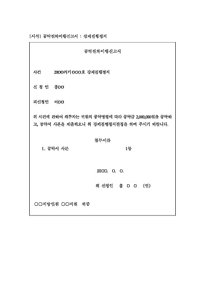 주요내용 : 강제집행정지신청, 법원의 공탁명령, 공탁서 제출 및 집행정지결정을 구하기 위한 목적으로 사용되어지는 신고서 양식임. 단 무단전재 방지목적으로 PDF 파일로 올리니, 구매하신 후 혹 원본 파일이 필요하신 분들은 톡이나 문자, 메일, 전화 등을 주시면 작성방법 등에 대한 간단한 무료상담과 함께 원본 파일을 보내드리도록 하겠습니다.