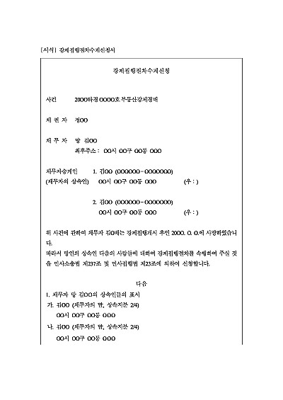 주요내용 : 강제집행개시 후 채무자 사망, 망인의 상속인으로 상대로 강제집행절차의 속행을 구하기 위한 목적으로 사용되어지는 신청서 양식임. 단 무단전재 방지목적으로 PDF 파일로 올리니, 구매하신 후 혹 원본 파일이 필요하신 분들은 톡이나 문자, 메일, 전화 등을 주시면 작성방법 등에 대한 간단한 무료상담과 함께 원본 파일을 보내드리도록 하겠습니다.