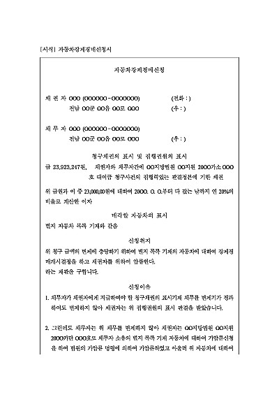 주요내용 : 채권충당을 위해 자동차를 강제경매하기 위한 목적으로 사용되어지는 신청서 양식임(담, 경매를 신청하기 전에 채무자의 자동차를 법원 집행관에게 인도받은 인도명령 절차를 먼저 진행하는 것이 일반적임). 단 무단전재 방지목적으로 PDF 파일로 올리니, 구매하신 후 혹 원본 파일이 필요하신 분들은 톡이나 문자, 메일, 전화 등을 주시면 작성방법 등에 대한 간단한 무료상담과 함께 원본 파일을 보내드리도록 하겠습니다.