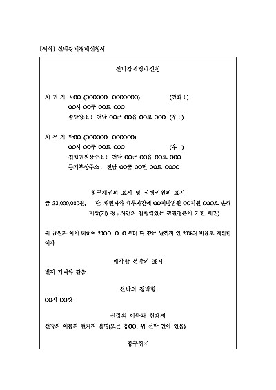 주요내용 : 가압류, 판결, 변제충당을 위하여 가압류된 선박에 대한 강제경매신청서 사용되어지는 양식임. 단 무단전재 방지목적으로 PDF 파일로 올리니구매하신 후 혹 원본 파일이 필요하신 분들은 톡이나 문자메일전화 등을 주시면 작성방법 등에 대한 간단한 무료상담과 함께 원본 파일을 보내드리도록 하겠습니다.