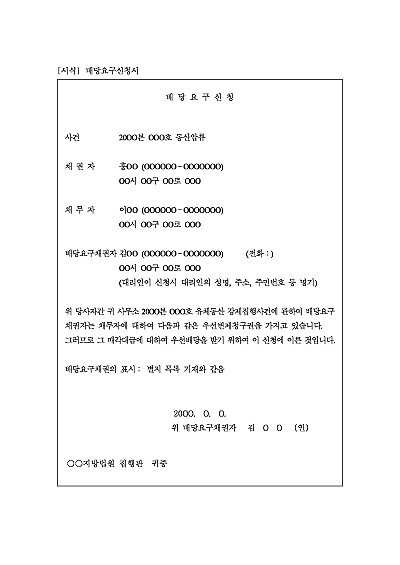 주요내용 :배당요구채권자, 우선변제청구권, 매각대금에서 우선 배당받기 위한 목적으롤 사용되어지는 신청서 양식임. 단 무단전재 방지목적으로 PDF 파일로 올리니, 구매하신 후 혹 원본 파일이 필요하신 분들은 톡이나 문자, 메일, 전화 등을 주시면 작성방법 등에 대한 간단한 무료상담과 함께 원본 파일을 보내드리도록 하겠습니다.