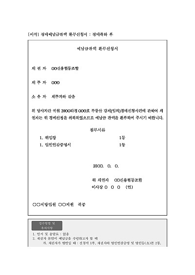 주요내용 : 경매신청 및 취하후 기납부한 예납금 중 잔액에 대한 환부신청서 사용되어지는 신청서 양식임. 단 무단전재 방지목적으로 PDF 파일로 올리니, 구매하신 후 혹 원본 파일이 필요하신 분들은 톡이나 문자, 메일, 전화 등을 주시면 작성방법 등에 대한 간단한 무료상담과 함께 원본 파일을 보내드리도록 하겠습니다.
