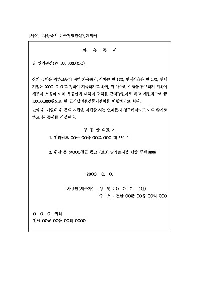 주요내용 : 금전차용에 대한 담보로 근저당설정시 사용되어지는 차용증 양식임. 단 무단전재 방지목적으로 PDF 파일로 올리니, 구매하신 후 혹 원본 파일이 필요하신 분들은 톡이나 문자, 메일, 전화 등을 주시면 작성방법 등에 대한 간단한 무료상담과 함께 원본 파일을 보내드리도록 하겠습니다.