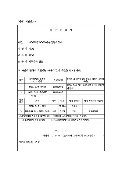 주요내용 : 경매절차에서 채권신고를 통해 법원에 채권자로 등록되어 채권조사, 이의진술, 의결권행사 등의 절차 참여 등을 통해 배당요구 권리 등을 확보할 목적으로 사용되어지는 신청서 양식임. 단 무단전재 방지목적으로 PDF 파일로 올리니구매하신 후 혹 원본 파일이 필요하신 분들은 톡이나 문자메일전화 등을 주시면 작성방법 등에 대한 간단한 무료상담과 함께 원본 파일을 보내드리도록 하겠습니다.