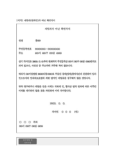 주요내용 : 일반적으로 해당 부동산에 거주하거나 점유하고 있는 사람이 자신이 주택임대차보호법상의 대항력 있는 임차인이 아니며, 따라서 경매 낙찰자에게 임차인으로서의 권리를 주장하지 않겠다는 것을 확인할 목적으로 사용되어지는 양식임. 단 무단전재 방지목적으로 PDF 파일로 올리니, 구매하신 후 혹 원본 파일이 필요하신 분들은 톡이나 문자, 메일, 전화 등을 주시면 작성방법 등에 대한 간단한 무료상담과 함께 원본 파일을 보내드리도록 하겠습니다.