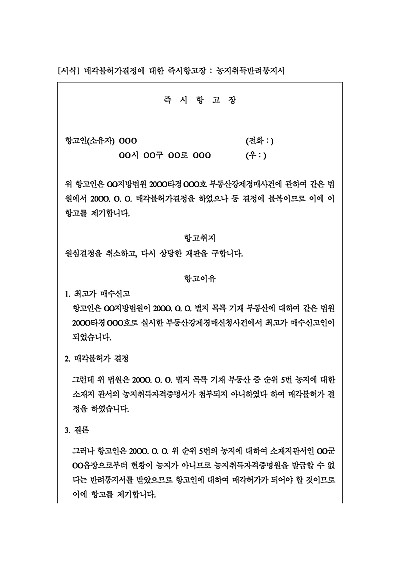 주요내용 : 경매 매수인, 경매절차에서 농지자격증명서 미첨부 이유로 매각하가불허결정, 현황 농지로 농지취득자격증명발급 불가 및 반려 통지 등의 사유로 매각허가불허결정에 대한 불복시 사용되어지는 항고장 양식임. 단 무단전재 방지목적으로 PDF 파일로 올리니, 구매하신 후 혹 원본 파일이 필요하신 분들은 톡이나 문자, 메일, 전화 등을 주시면 작성방법 등에 대한 간단한 무료상담과 함께 원본 파일을 보내드리도록 하겠습니다.