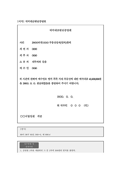 주요내용 : 매각대금납부증명원은 시군구에 등록세납부서를 받을 목적으로 사용되어지는 양식임. 단 무단전재 방지목적으로 PDF 파일로 올리니, 구매하신 후 혹 원본 파일이 필요하신 분들은 톡이나 문자, 메일, 전화 등을 주시면 작성방법 등에 대한 간단한 무료상담과 함께 원본 파일을 보내드리도록 하겠습니다.