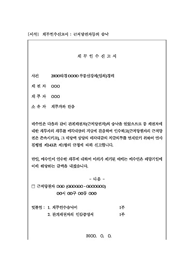 주요내용 : 낙찰자가 매각대금 전액을 법원에 납부하는 대신, 대각물건에 포함된 채무를 인수하여 매각대금에 갈음할 목적으로 사용되어지는 신고서 양식임. 단 무단전재 방지목적으로 PDF 파일로 올리니, 구매하신 후 혹 원본 파일이 필요하신 분들은 톡이나 문자, 메일, 전화 등을 주시면 작성방법 등에 대한 간단한 무료상담과 함께 원본 파일을 보내드리도록 하겠습니다.
