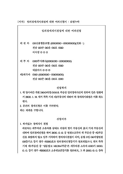 주요내용 : 감정누락, 담보권의 부존재나 무효, 채권소멸, 변제 등의 사유로 경매절차가 부적법하거나 부당하다고 판단될 때 법원에 해당 결정을 취소해달라고 요청하여 경매 절차를 중단시키거나 취소시키기 위한 목적으로 사용되어지는 신청서 양식임. 단 무단전재 방지목적으로 PDF 파일로 올리니, 구매하신 후 혹 원본 파일이 필요하신 분들은 톡이나 문자, 메일, 전화 등을 주시면 작성방법 등에 대한 간단한 무료상담과 함께 원본 파일을 보내드리도록 하겠습니다.