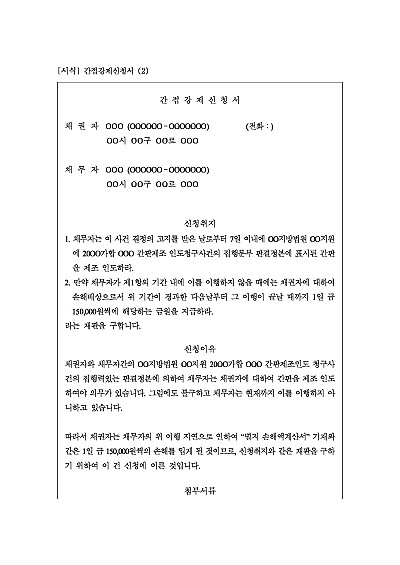 주요내용 : 채무자가 판결 등에서 정해진 의무를 이행하지 않을 경우, 채무자에게 심리적 압박을 가하여 의무 이행을 유도하고 불이행 시 지연 기간에 따라 손해배상금(간접강제금)의 지급을 구하기 위한 목적으로 사용되어지는 신청서 양식임. 단 무단전재 방지목적으로 PDF 파일로 올리니구매하신 후 혹 원본 파일이 필요하신 분들은 톡이나 문자메일전화 등을 주시면 작성방법 등에 대한 간단한 무료상담과 함께 원본 파일을 보내드리도록 하겠습니다.