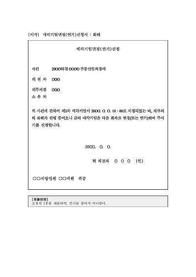 주요내용 : 경매절차 진행을 잠시 멈추고 기일을 나중에 미루어 법적, 현실적 문제해결및 절차 진행 준비를 위한 시간을 확보하기 위한 목적으로 사용되어지는 신청서 양식임. 단 무단전재 방지목적으로 PDF 파일로 올리니, 구매하신 후 혹 원본 파일이 필요하신 분들은 톡이나 문자, 메일, 전화 등을 주시면 작성방법 등에 대한 간단한 무료상담과 함께 원본 파일을 보내드리도록 하겠습니다.