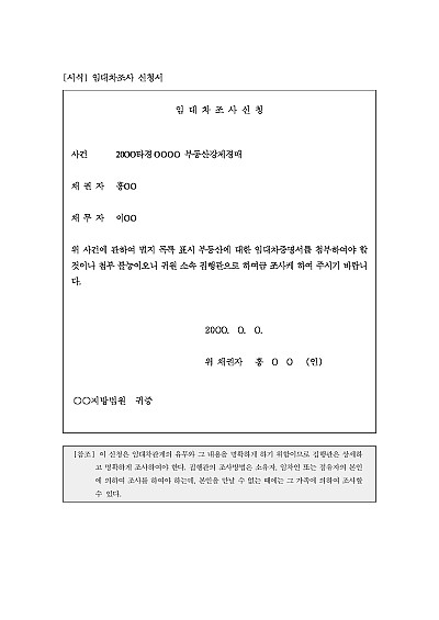주요내용 : 강제경매신청시 임대차관계 유무와 그 내용을 명확히 하기 위한 목적으로 그 조사를 신청하기 위한 목적으로 사용되어지는 신청서 양식임. 단 무단전재 방지목적으로 PDF 파일로 올리니구매하신 후 혹 원본 파일이 필요하신 분들은 톡이나 문자메일전화 등을 주시면 작성방법 등에 대한 간단한 무료상담과 함께 원본 파일을 보내드리도록 하겠습니다.