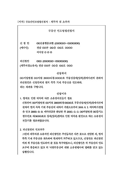 주요내용 : 경매 낙잘차가 대금 완납 후에도 점유를 거부하는 채무자, 소유자, 대항력 없는 임차인 등으로부터 부동산을 신속하고 강제적으로 인도받기 위한 목적으로 사용되어지는 신청서 양식임. 단 무단전재 방지목적으로 PDF 파일로 올리니구매하신 후 혹 원본 파일이 필요하신 분들은 톡이나 문자메일전화 등을 주시면 작성방법 등에 대한 간단한 무료상담과 함께 원본 파일을 보내드리도록 하겠습니다.